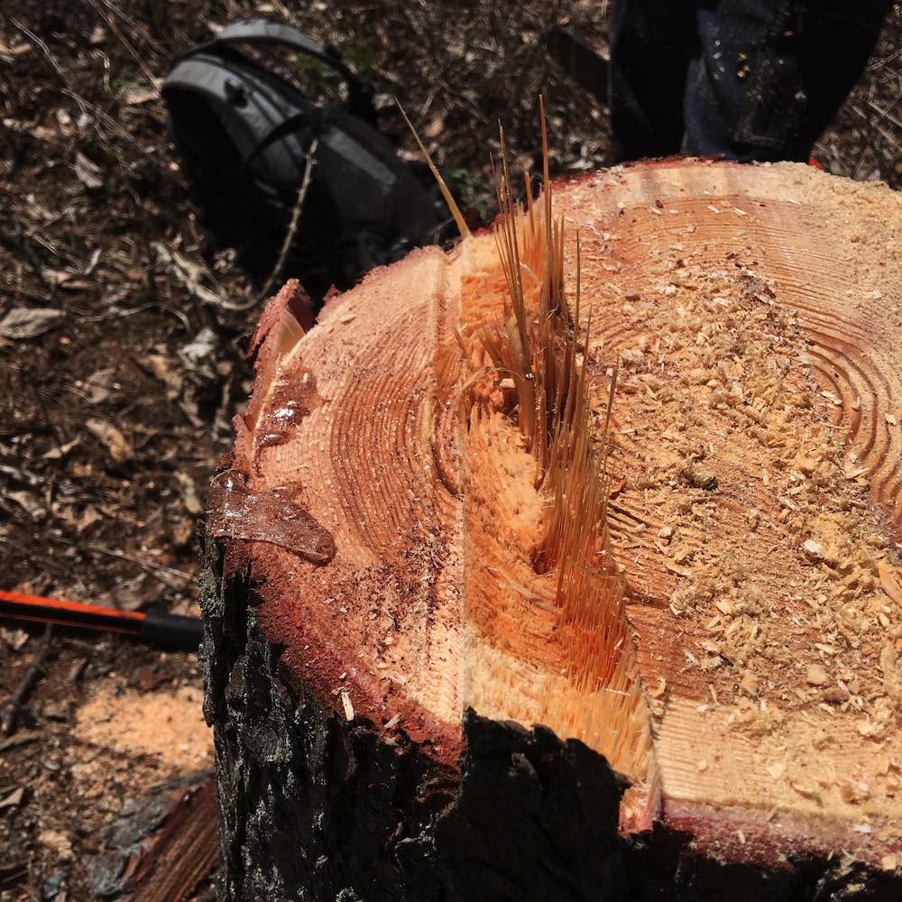 このように殆どの木はクサビ(矢)を使用して任意の方向に伐倒します。