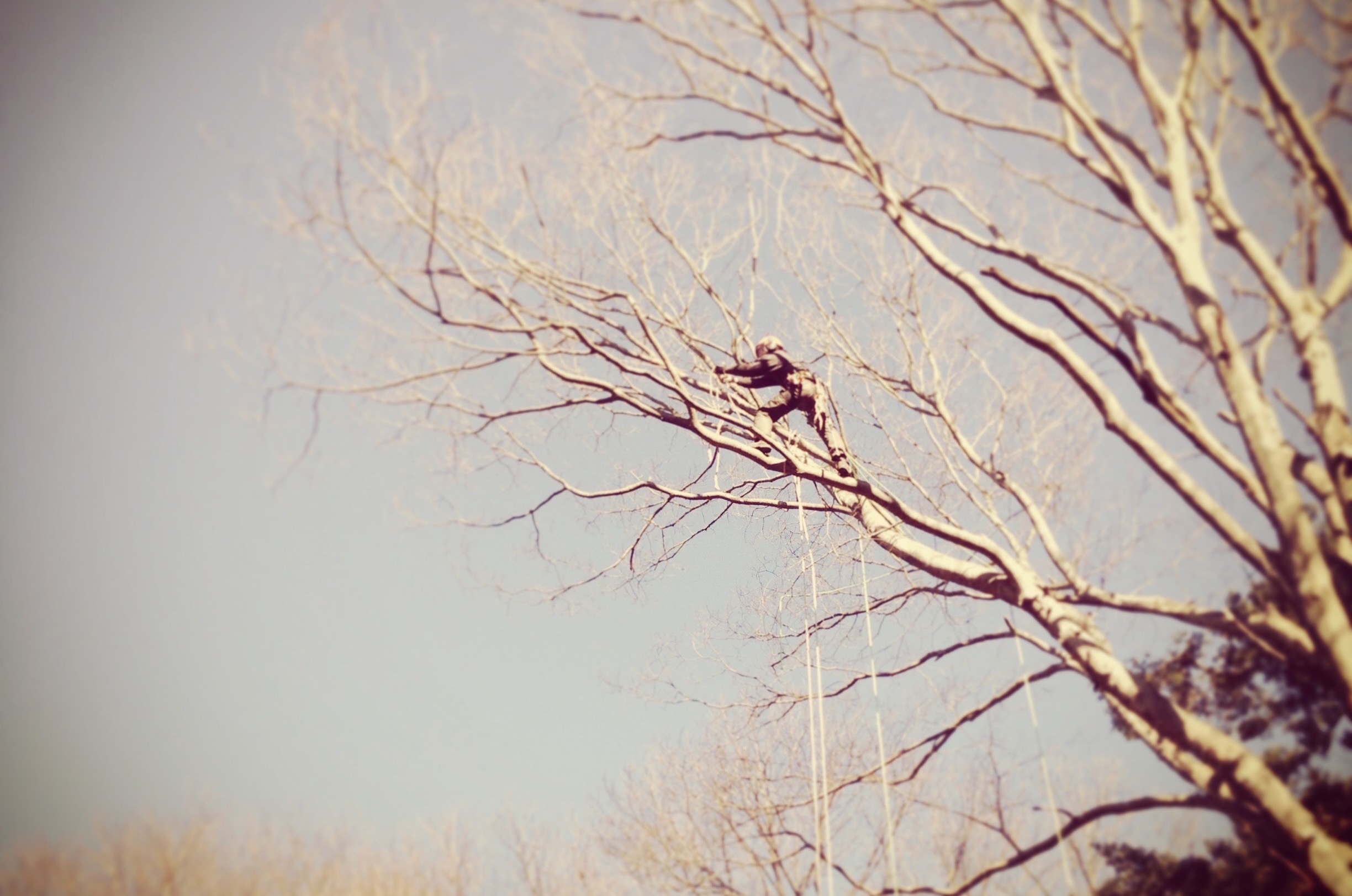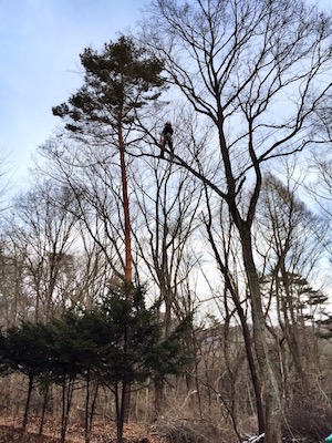 作業者が直接伐採する木に登り、高強度ロープを使い上部より吊るし切りにします。
